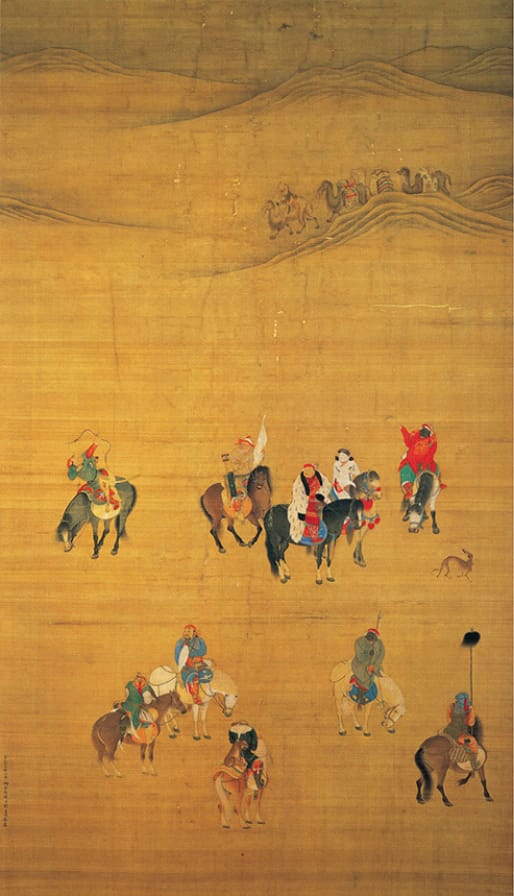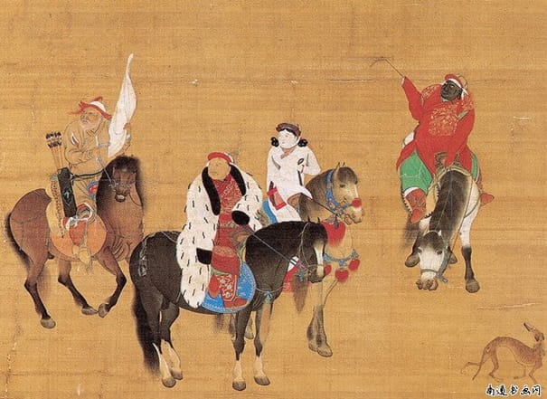 Дөрөвдүгээрт, хатны ард талд байгаа бараа бологч харваас хар арьст боол авай. Наад талд нь бас нэг хар арьст боол харагдана. Зургийн доод хэсэгт цааш харан яваа морьтныг музейн тайлбарлагч зааж “Цайвар шар үстэй энэ хүн Дундад Азийн, магадгүй, Европ зүгийн хүн” гэсэн юм. Тун магадгүй. Ази, Европын хэдэн арван улс орныг нэгтгэсэн Монголын их гүрний төрд арван зүгийн есөн хэлийн хүн зон хүчээ өргөн зүтгэж байсан билээ. Тэдний дотор их уран дархан Анигаа тэргүүт балбын урчуул дархчуул, Хубилай хаанаас Улсын багш цол хүртсэн Пагва лам тэргүүт түвд, тангад зүгийнхэн, одон орон судлалыг хөгжүүлсэн араб, персийн иргэд, Ромын папын элч болж ирээд 17 жил хааны дэргэд шадарлан зүтгэсэн Марко Поло тэргүүт түүний аав, авга ах зэрэг европчууд олон байсан билээ.